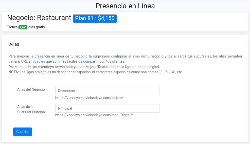 Captura el nombre o alias de tu negocio y los nombre o alias de tus sucursales. Presiona el botón guardar para registrar los alias.